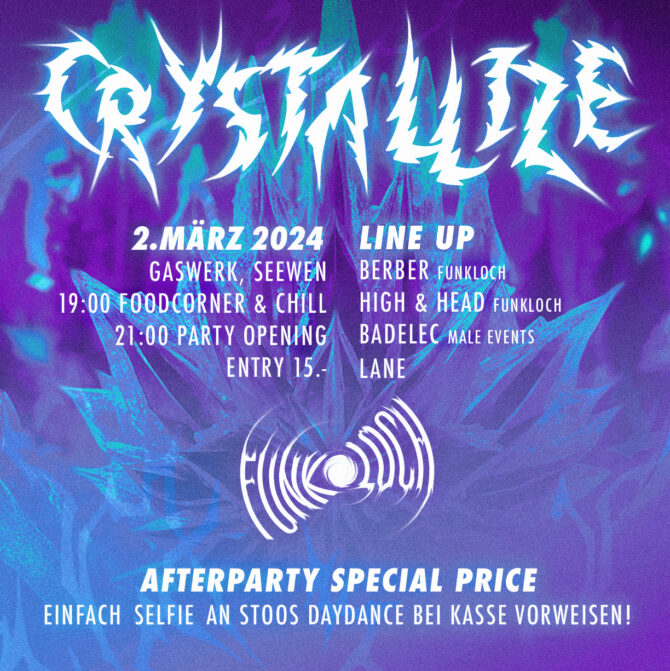 Ein Neustart steht unmittelbar bevor – und doch finden wir unsere Wurzeln wieder. Altbekannte Locations erstrahlen in neuem Glanz, und bietet ausserdem ein stimmiges Finish für den langersehnten Stoos Daydance! Ab 19:00 bieten wir einen gemütlichen Chillout mit Glühwein und Verpflegung, bevor um 21:00 unsere DJ’s dann die Eishöhle richtig einheizen. Nicht vergessen: Wenn ihr an der Kasse ein Selfie mit unserer idyllischen Stoos Stage vorweisen könnt, erhaltet ihr vergünstigten Eintritt!