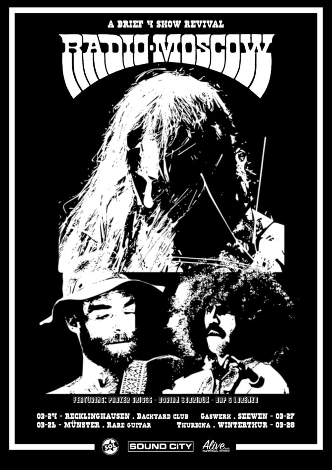 Radio Moscow Revival (USA), angeführt von Gitarrist & Sänger Parker Griggs und dem ehemaligen Blues Pills-Gitarristen Dorian Sorriaux, ist eine Heavy Psych-Supergroup. Die berauschende Kombination aus Psych-Rock, Funk, Latin-Rock und Soul kommt in einer blitzschnellen Welle des Schredderns zusammen. Ein klassisches Set von Radio Moscow (USA) Songs wird zum ersten Mal seit 6 Jahren wieder live gespielt!