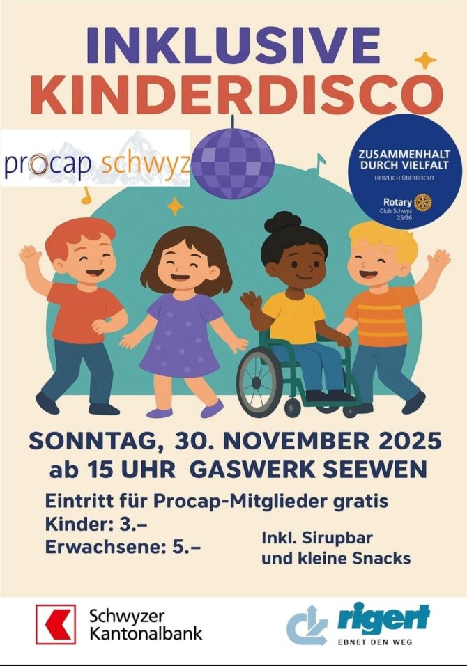 Am Sonntag, 30.November 2025 öffnet das Gaswerk gemeinsam mit Procap Schwyz und der Unterstützung des Rotary Club Schwyz ab 15 Uhr bis ca. 19 Uhr seine Tore und feiert gemeinsam mit vielen freudigen Kinderaugen und -ohren eine inklusive Kinderdisco. Für die geballte Ladung an Kindersongs wird DJ Cello Bello sorgen.
