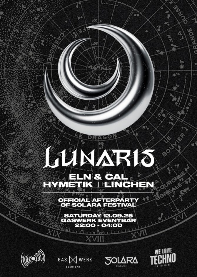 Auch wenn Solara dieses Mal im Verborgenen bleibt, öffnet sich in der Nacht das Tor zu Lunaris. Unter Sternen und zwischen Schatten erwarten euch treibende Klänge von Techno bis Hardtechno – dunkel, energiegeladen und grenzenlos.