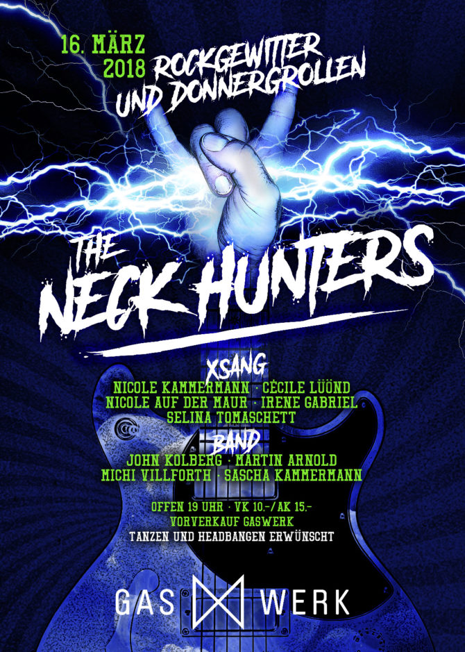 Wir schwelgen einen Abend in Nostalgie, mit heutiger Energie – volle Pulle drauflos. «The Neck Hunters» bestehen aus Martin Arnold (Bass), John Kolberg (Gitarre), Michael Villforth (Gitarre), Sascha Kammermann (Schlagzeug). Gesang: Nicole Kammermann, Cécile Lüönd, Irene Gabriel, Selina Tomaschett, Nicole Auf der Maur.