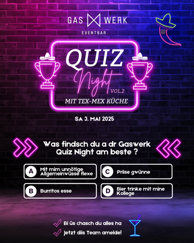Meldet euch mit eurem Team (max. 5 Personen) an und stellt euer Wissen unter Beweis. Einfach eine DM auf Instagram oder eine Mail an info@gaswerk-eventbar.ch mit eurem Teamnamen + Anzahl Spieler:innen schicken und ihr seid dabei!