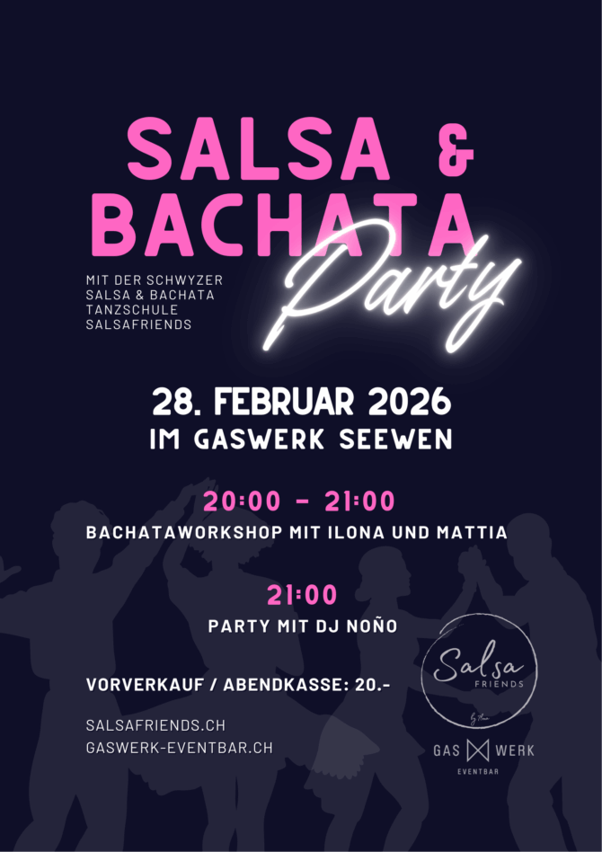 Der Abend wird von Salsafriends organisiert – einer jungen Tanzschule mit Herz, die in Schwyz mit viel Engagement eine lebendige Salsa-Tanzszene aufbaut. Lerne bei dieser Gelegenheit die Menschen dahinter kennen, probier dich auf der Tanzfläche aus und entdecke, wie viel Spass Tanzen macht!