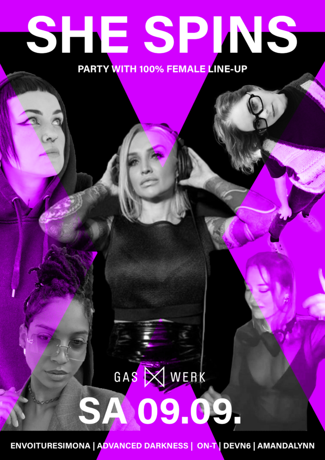 Der revolutionärste Sound-Mix aus dem DJ-Universum! An der Premiere des neuen Gaswerk Party-Labels «She Spins» stehen fünf kreative, charismatische und vor allem unglaublich talentierte Künstlerinnen hinter den DJ Turntables. Ihre Mixes werden Eure Sinne erwecken! Von pulsierenden Beats, catchy Sing-alongs, zu exotischen Disco Sounds bis hin zu Club-Hit-Classics. Kommt vorbei und feiert mit diesen fünf Künstlerinnen «a hell of a party»! Vertraut uns – die Vibes welche hier von der Bühne kommen werden Euch fesseln!